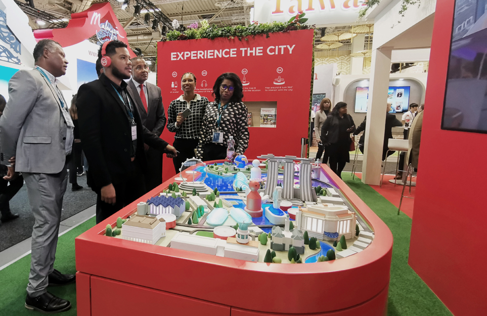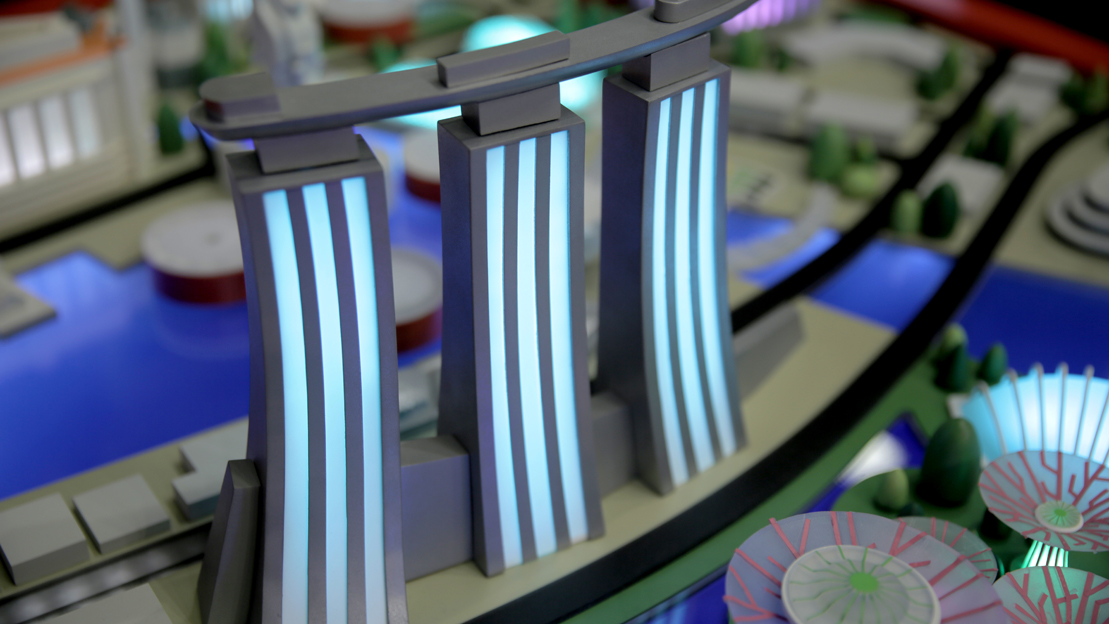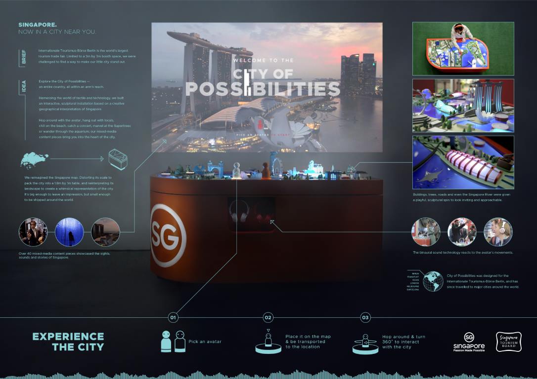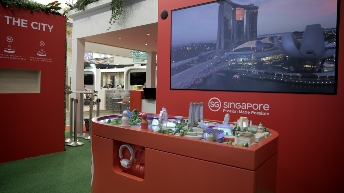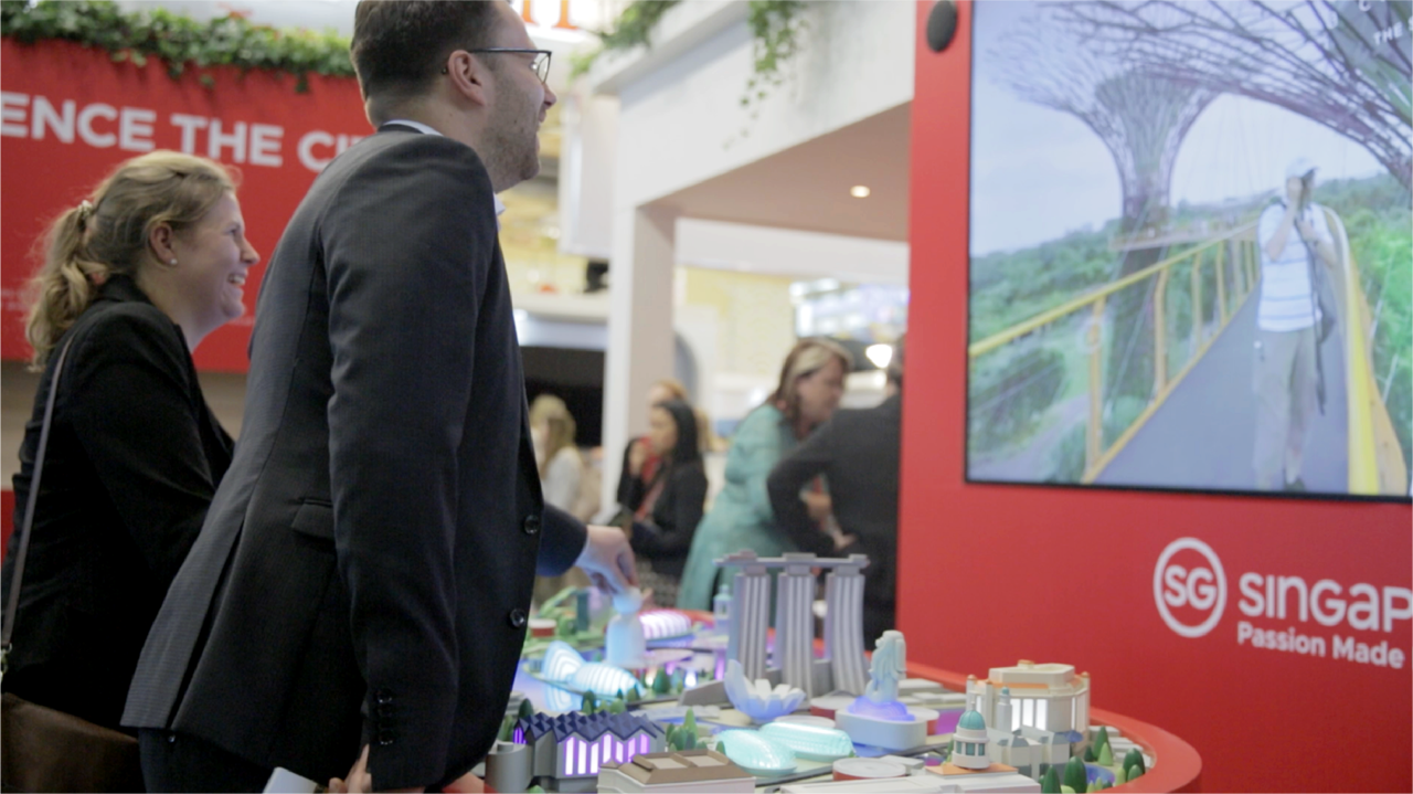 City of Possibilities was an interactive installation for the Singapore Tourism Board, designed to showcase the country at global trade shows and consumer events. The brief called for something immersive — but not isolating. STB wanted the depth and engagement of a VR experience while keeping it physical, present and social. No headsets, no closing people off from the room. The result was a detailed physical model featuring eight iconic Marina Bay and Sentosa landmarks — Gardens By The Bay, Marina Bay Sands, National Gallery, Siloso Beach, Merlion Park, Esplanade, Resorts World Sentosa, and Raffles Hotel — that doubled as a console for immersive virtual tours.