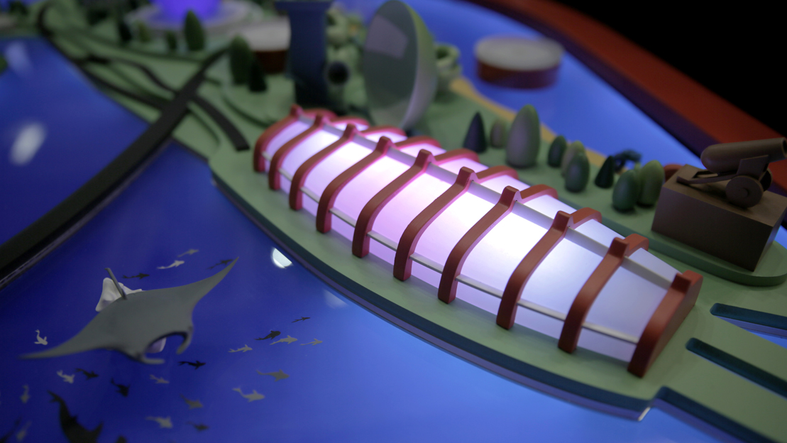 Two physical avatars could be placed on hotspot pads across the model, initiating 360-degree video tours on a large screen. Rotating the avatars changed the viewing angle, and placing both simultaneously activated a split-screen for two users. The experience was enhanced with ambisonic spatial audio through headphones, and leveraged RFID and 3D printing to bring Singapore to life. It delivered all the richness of an immersive experience while keeping people face-to-face and present in the space.